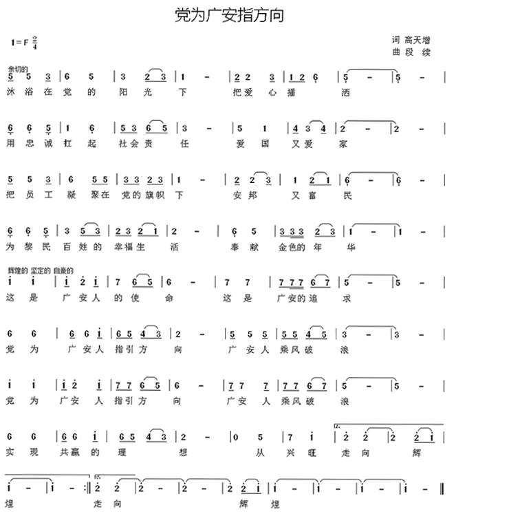 沐浴在黨的陽光下, 把愛心播灑;用忠誠扛起社會責任, 愛國又愛家;把員工凝聚在黨的旗幟下, 安邦又富民;為黎民百姓的幸福生活, 奉獻金色的年華;這是廣安人的使命, 這是廣安的追求;黨為廣安人指引方向, 廣安人乘風波浪;黨為廣安人指引方向, 廣安人乘風波浪;實現(xiàn)共贏的理想, 從興旺走向輝煌, 走向輝煌。